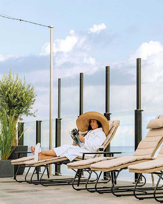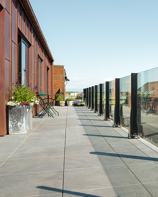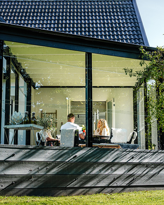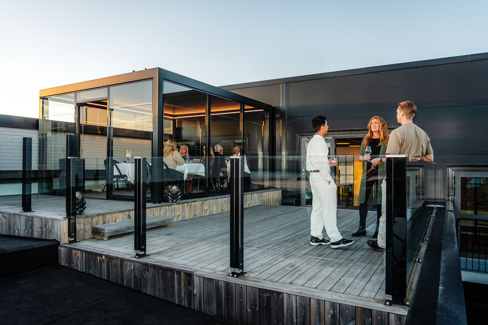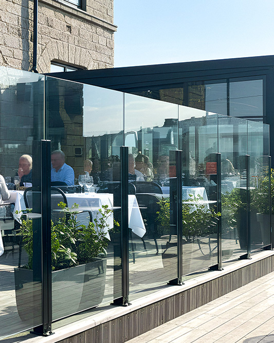 Lasikaiteet vapailla reunoilla ja tuulisuojalla, jotka voidaan helposti nostaa ja laskea